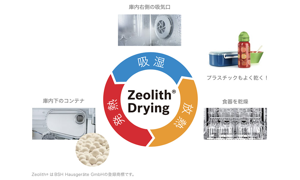 庫内の蒸気を乾燥熱に変えて食器乾燥を 促す「ゼオライト・ドライ」や庫内の熱で洗浄水を温める